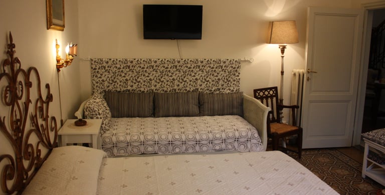 Lilla Room is located on the ground floor and has a large French window that opens directly onto the garden, where you will find a corner equipped just for you. The room is furnished in a classic style, warm and welcoming and has a sofa / bed, a smart monitor, heating and air conditioning. The room has a small private bathroom complete with window. It has a floor shower, sink, toilet / bidet, heating and hairdryer. You will also find the face and body moisturizing cream, the vanity kit and everything you need for a relaxing shower.
